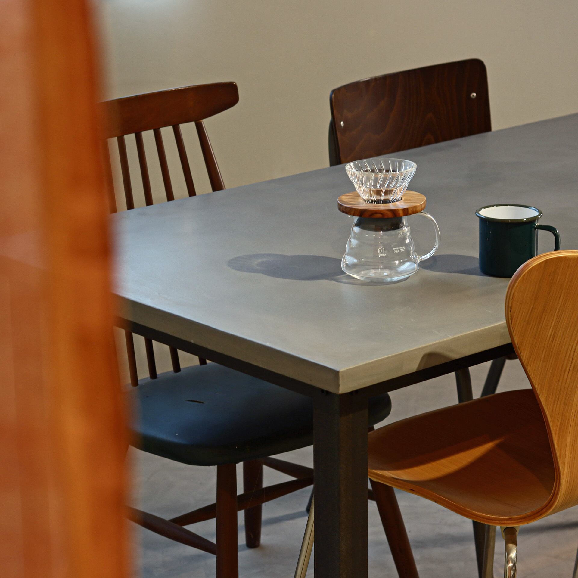 鋼管:50*50mm|耐荷重:50kg|板厚:3cm|天板:左官モルタル|鉄部塗装:黒皮+蜜蝋仕上|組立式